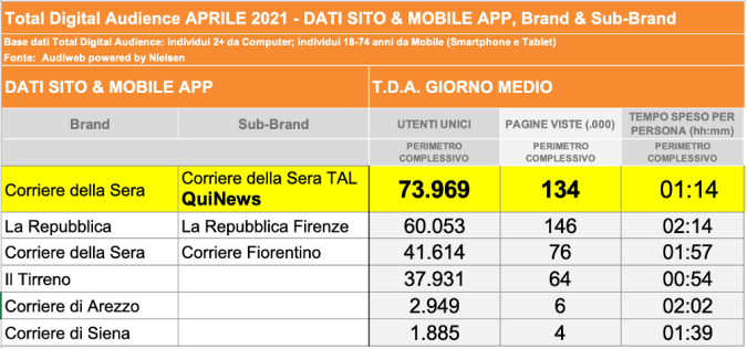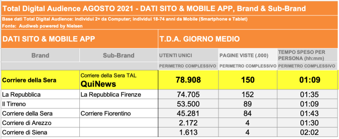 I DATI AUDIWEB DEL MESE DI NOVEMBRE 2020 NON SONO PRESENTI PER ADEGUAMENTO TECNICO DELLA RILEVAZIONE DEL NETWORK QUINEWS COME SUB BRAND DEL CORRIERE DELLA SERA